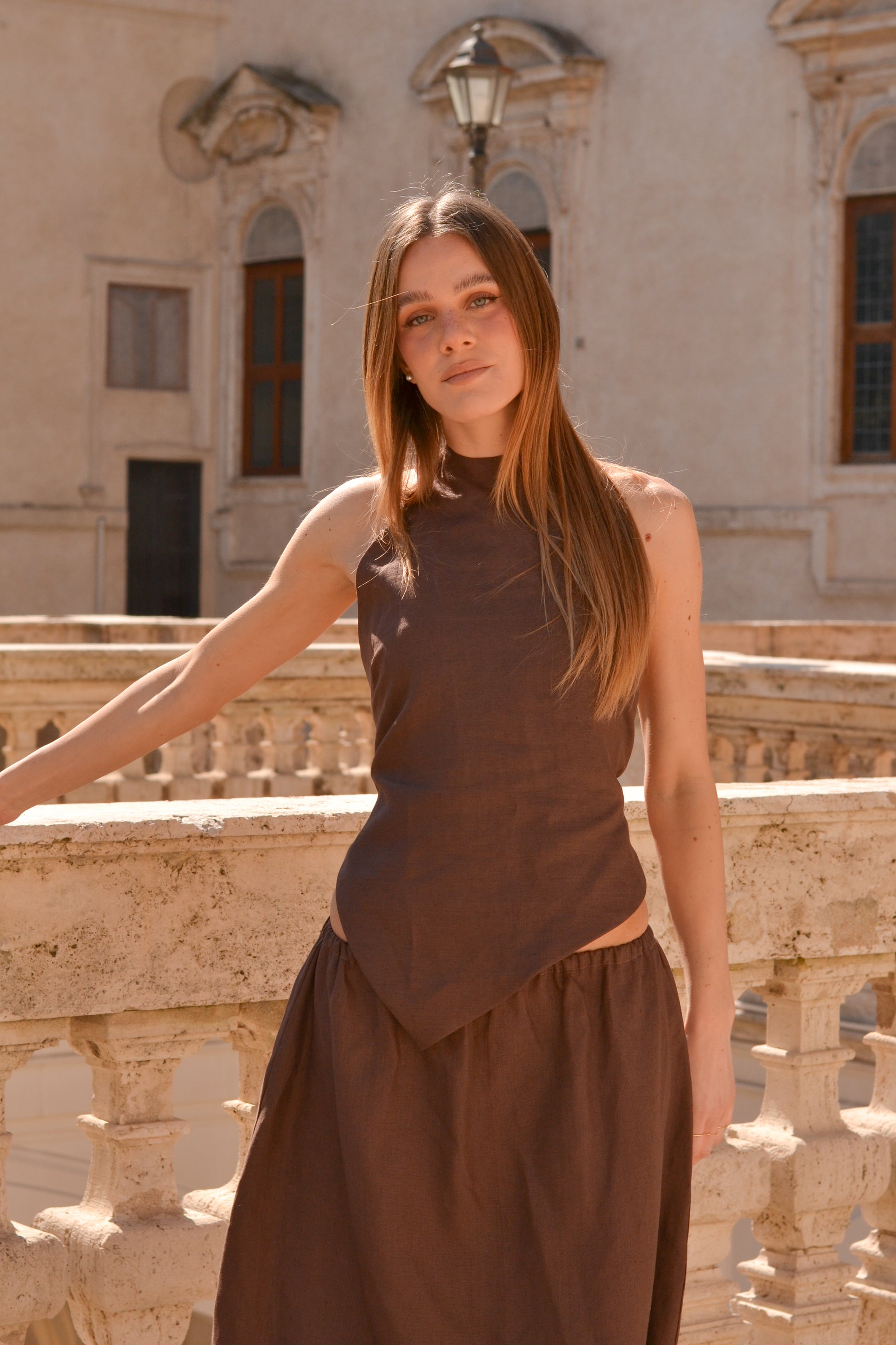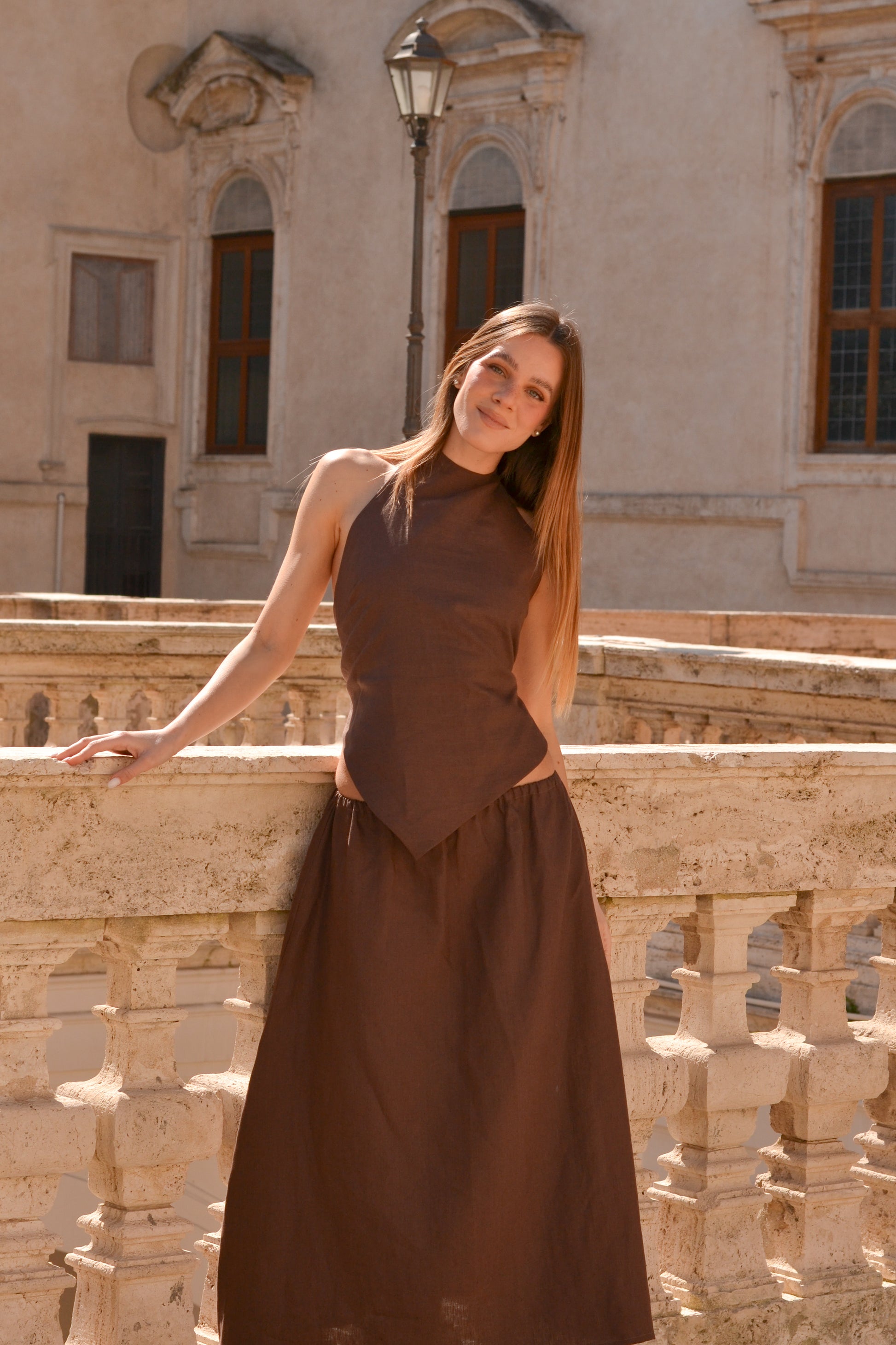 The Lais top is this summers cheekiest top.  It has a back bow closure and is also available in brown linen. Match it with the Lais skirt to make it a whole set