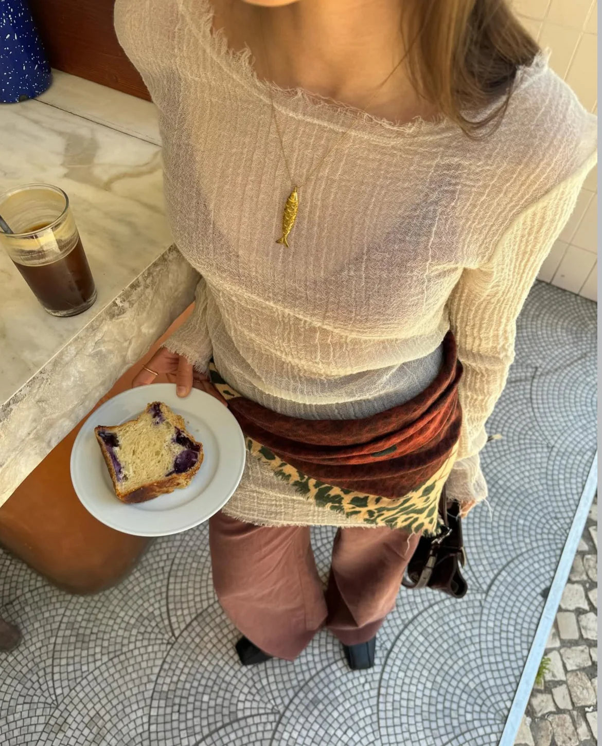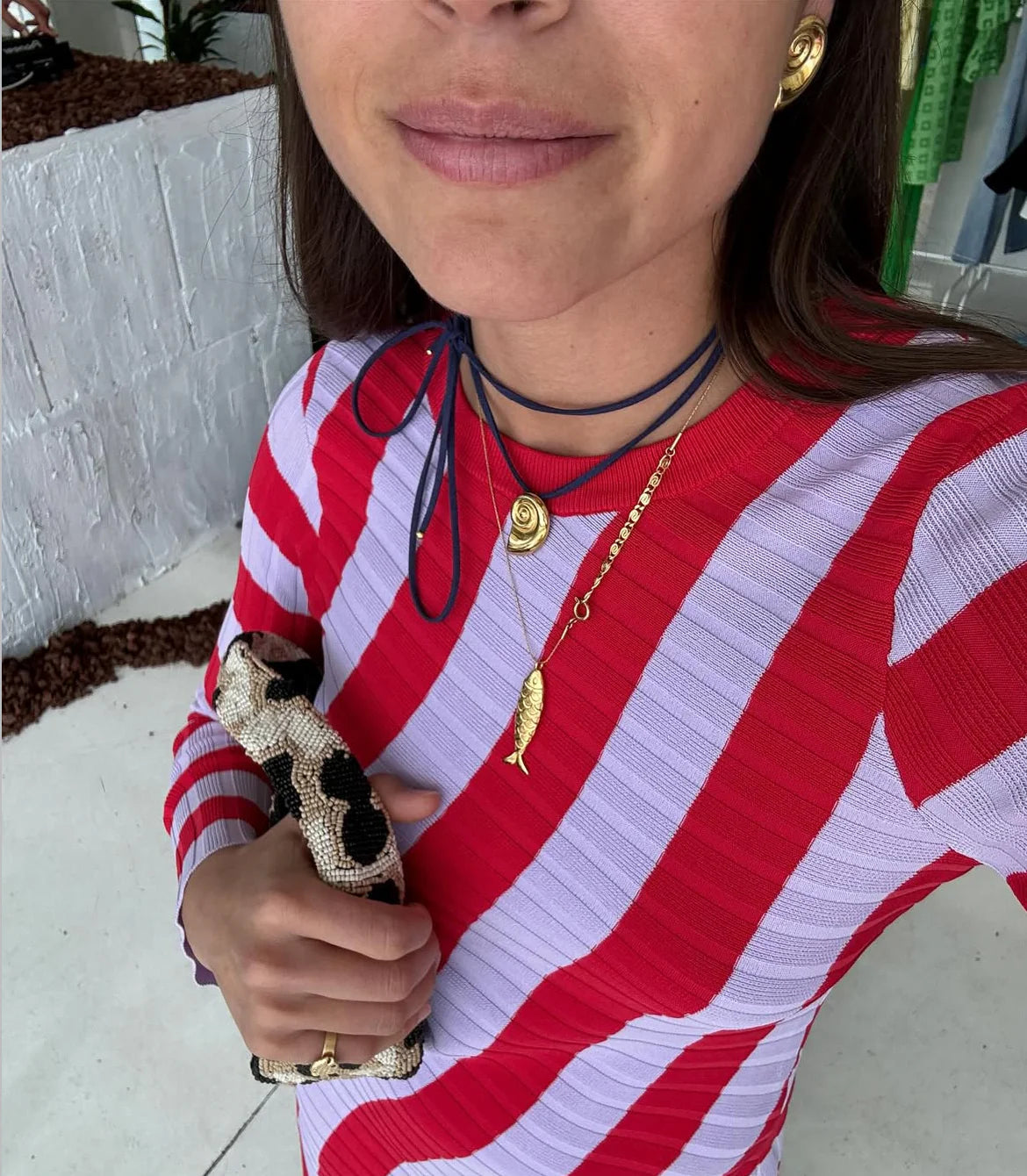 The Joana Necklace has a golden fish pendant and is inspired by strolls along the Portuguese quays. Both simple and refined, the Joana necklace can be worn alone or paired with a choker.
