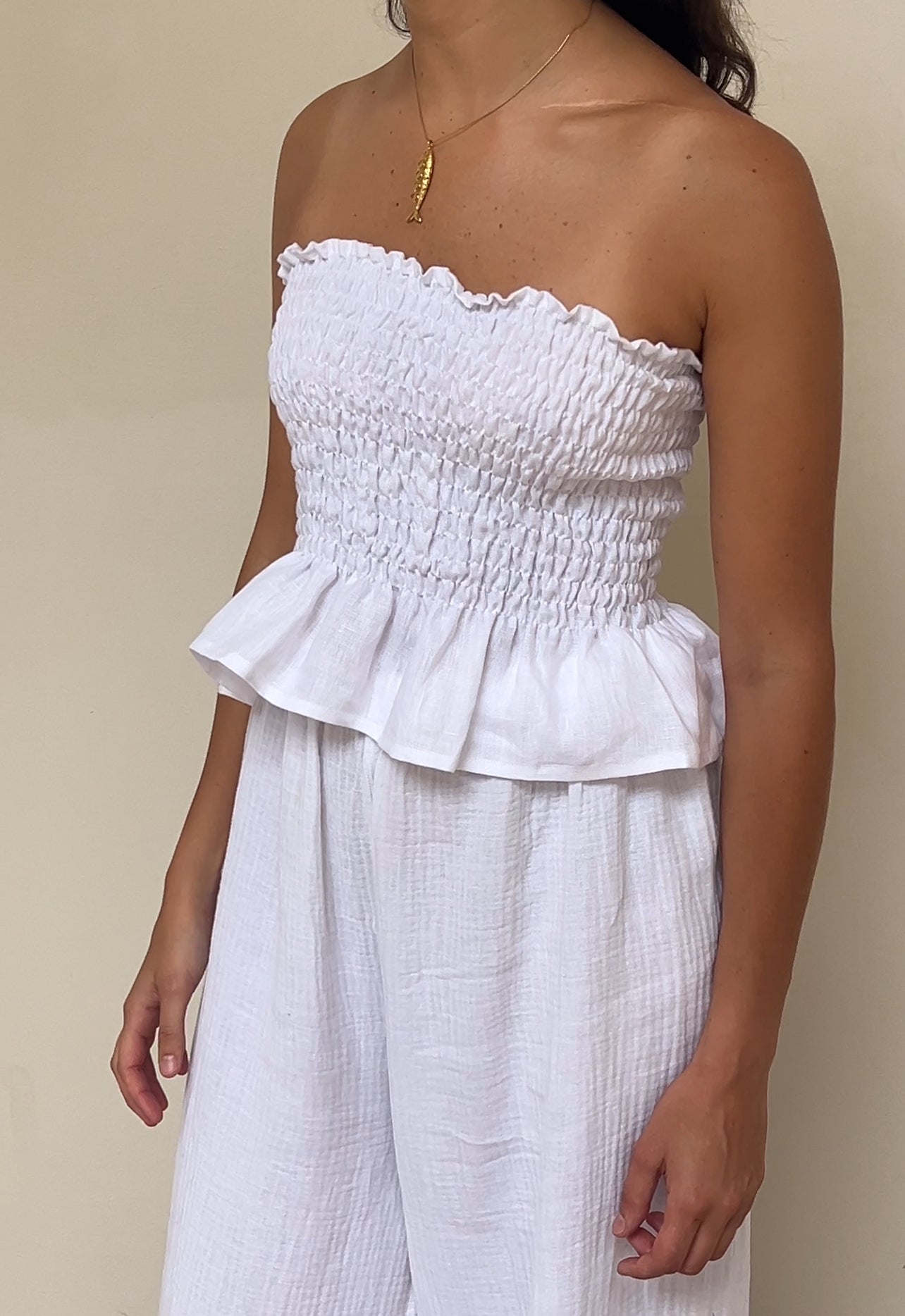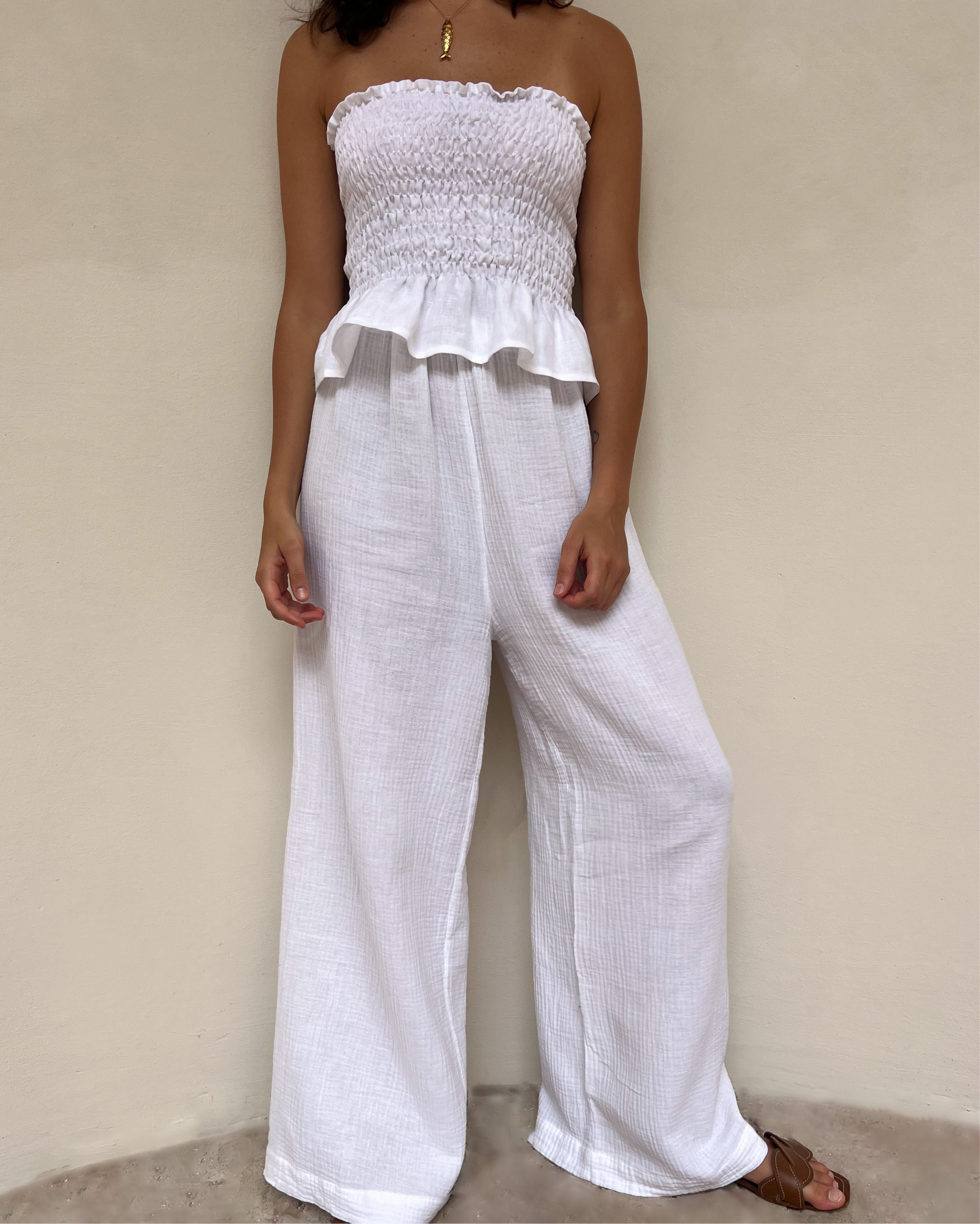 The Carly Pant is a timeless piece made from double cotton gauze, featuring an elastic waistband for comfort. For a complete look, pair with the Carly Top.