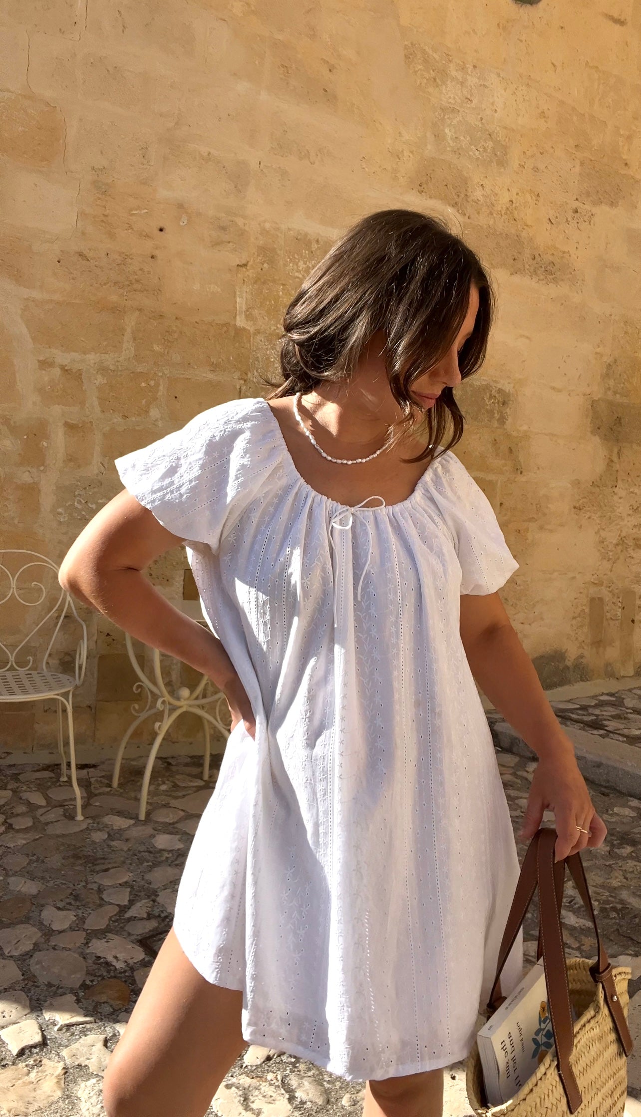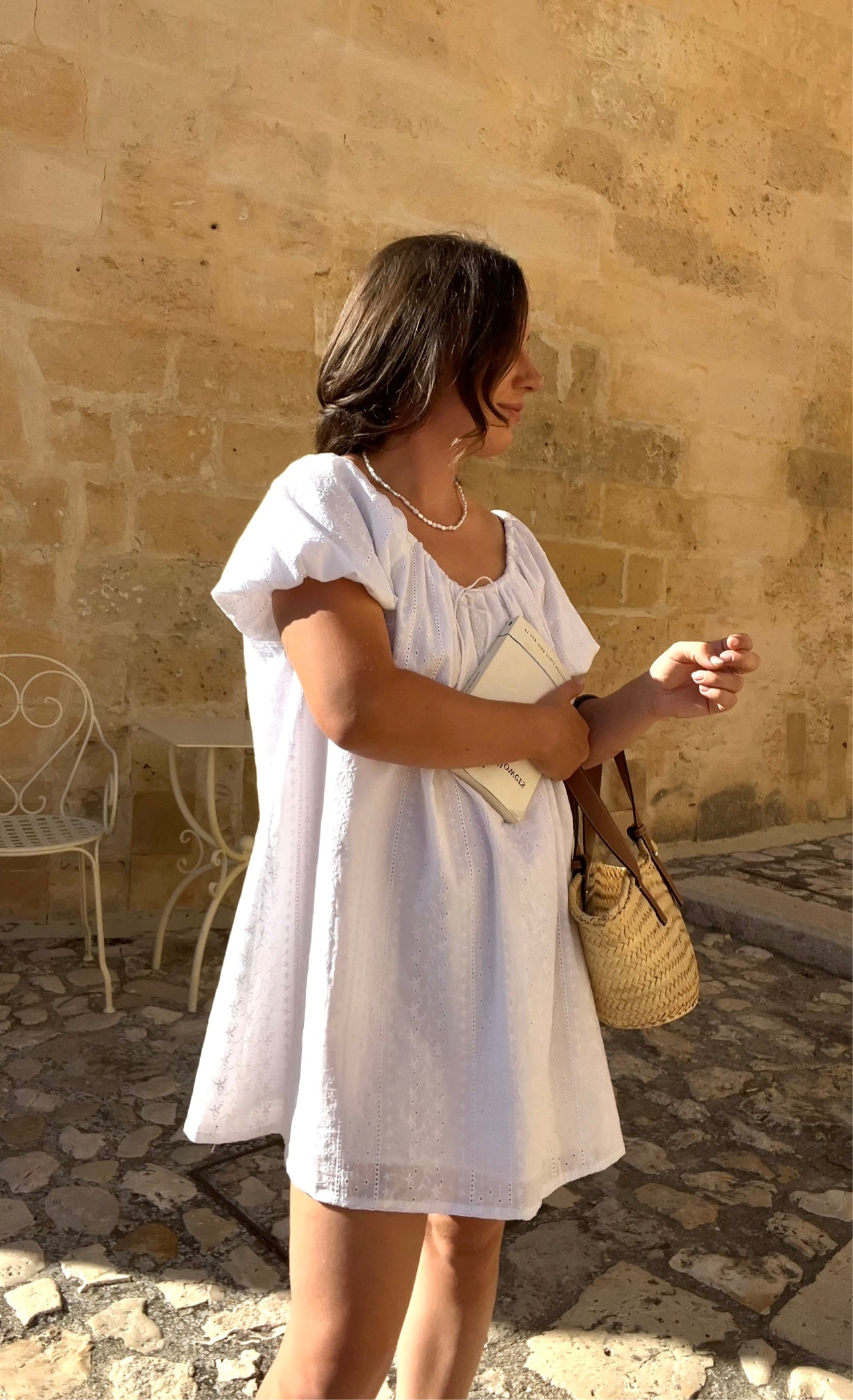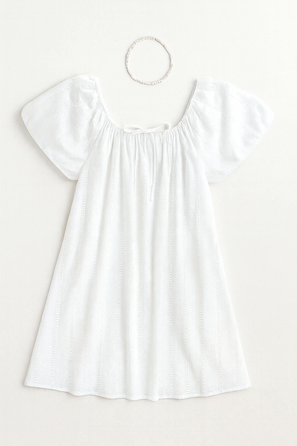 The Daisy Dress has an adjustable neckline and short puffy sleeves. Made with the same cotton as the Eva skirt to be able to mix and match together. Also available as a top.