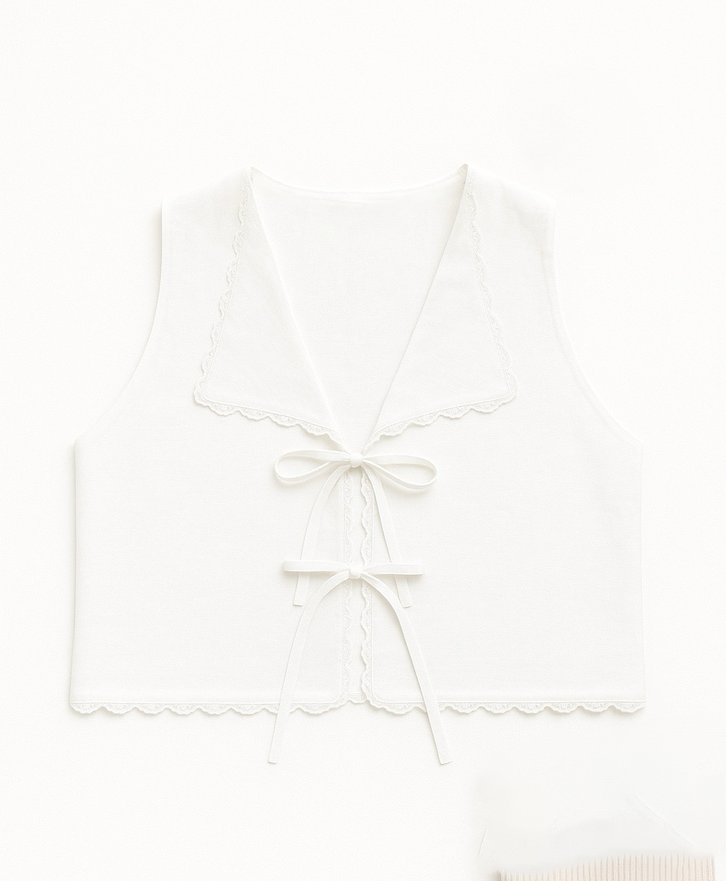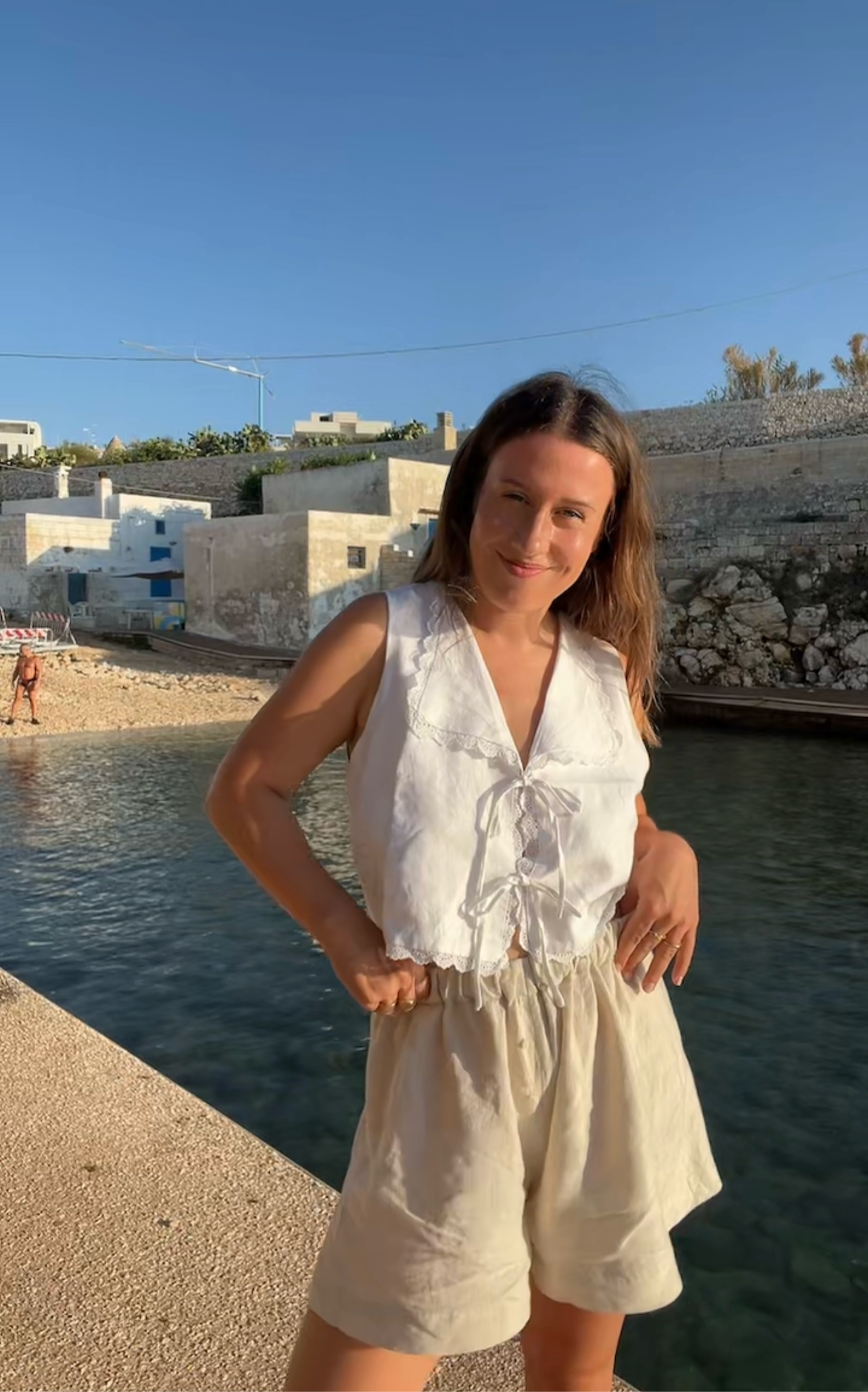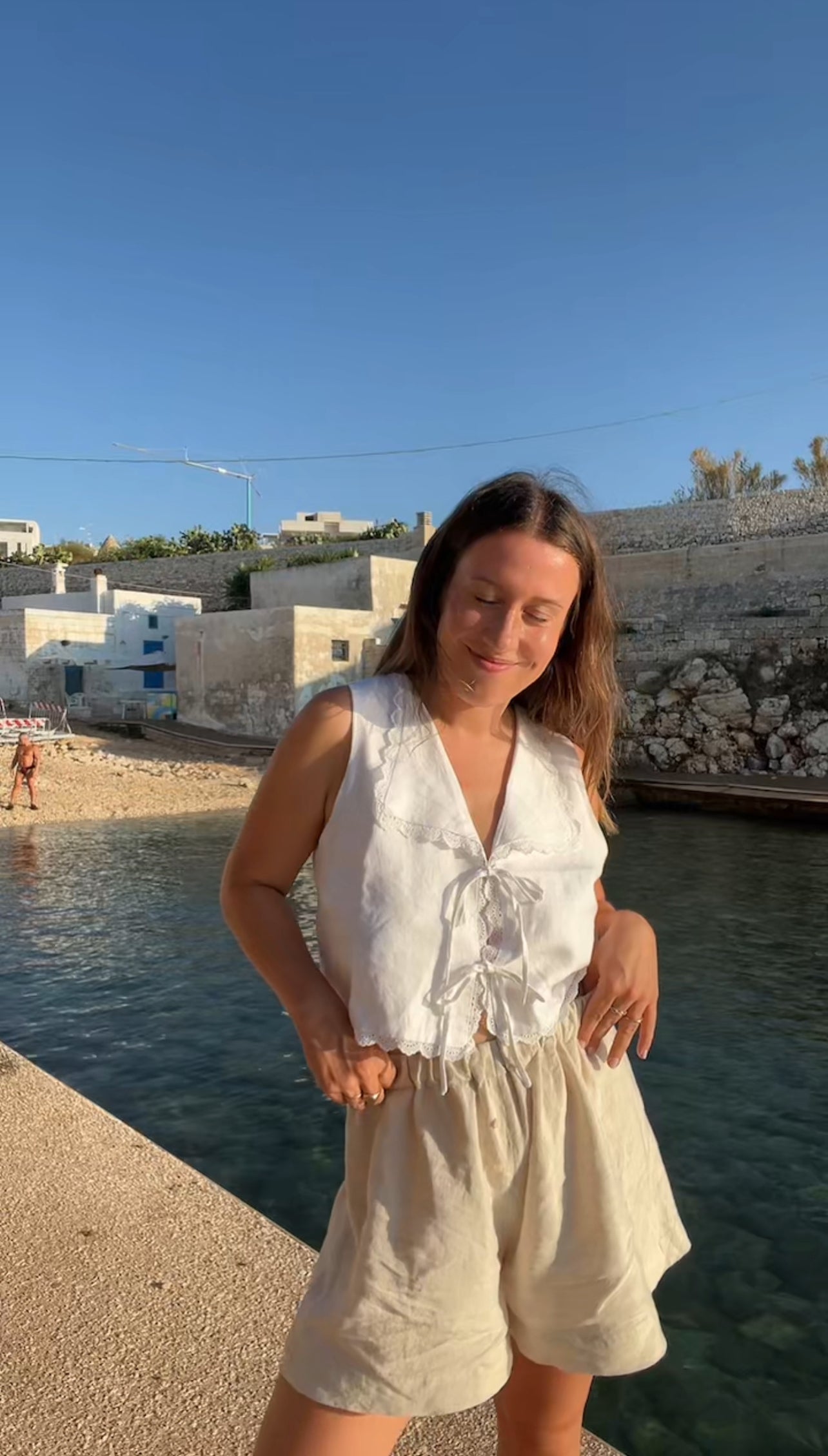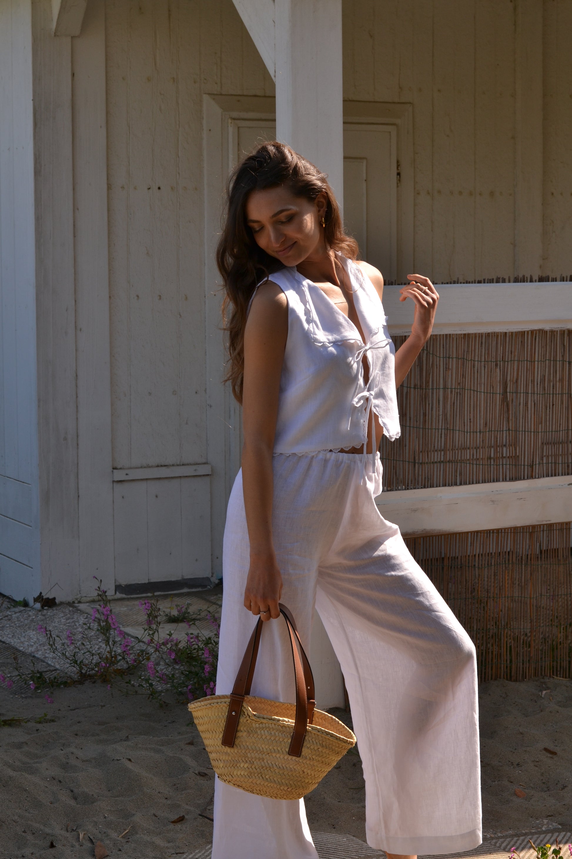 The Harper Top has a front tie closure and delicate lace details. Made with 100% linen. Pair it with the Matilda shorts for a full look.
