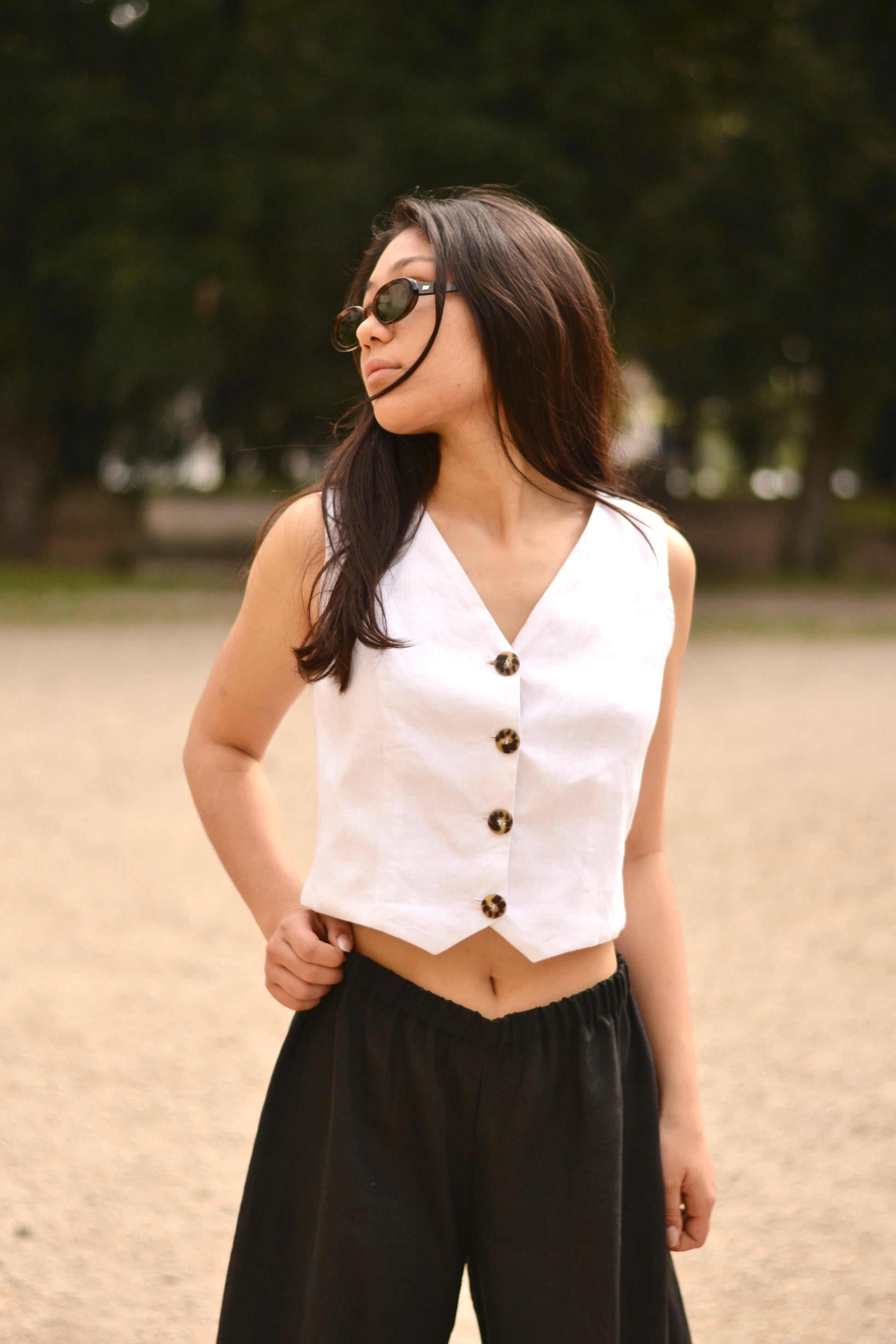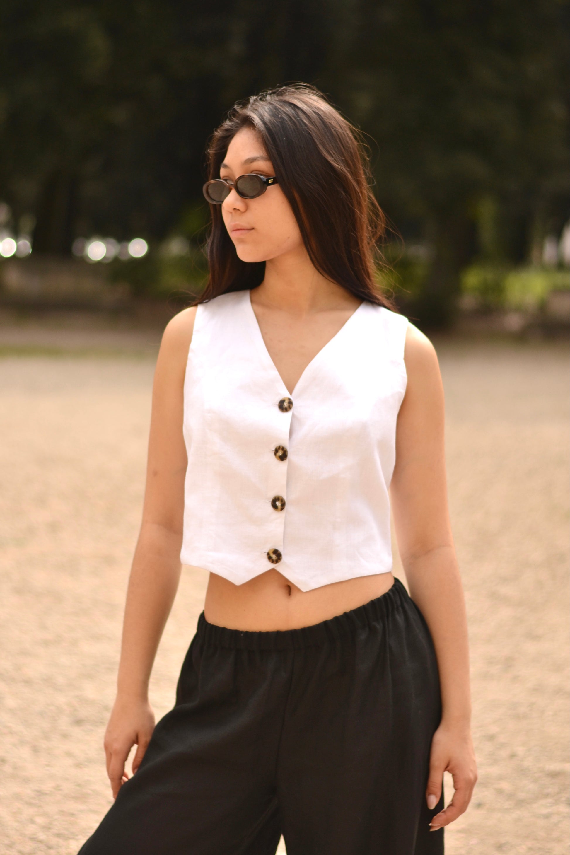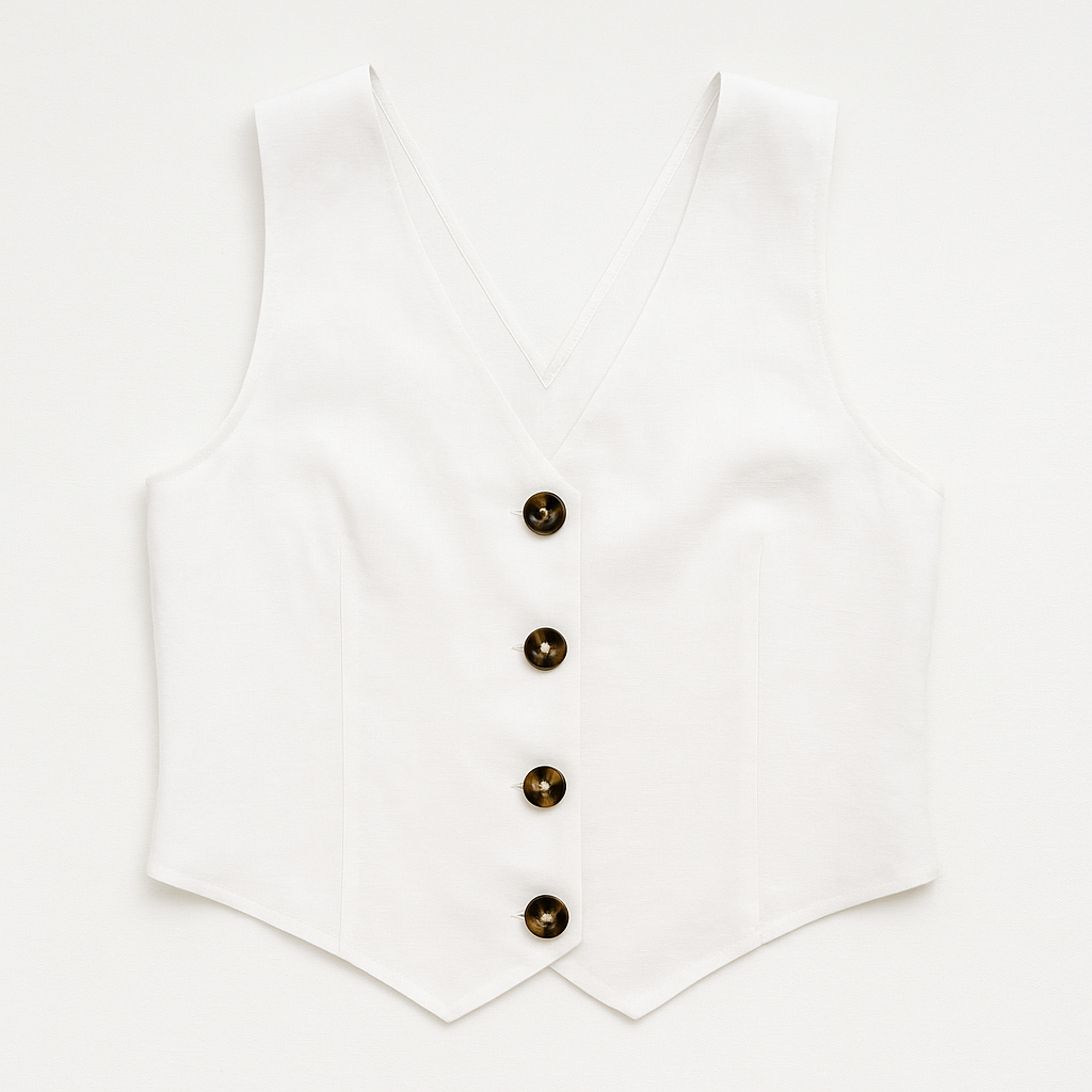 The Lia Vest has a feminine silhouette and a front button closure. A staple to your wardrobe, match it with our Jade short.