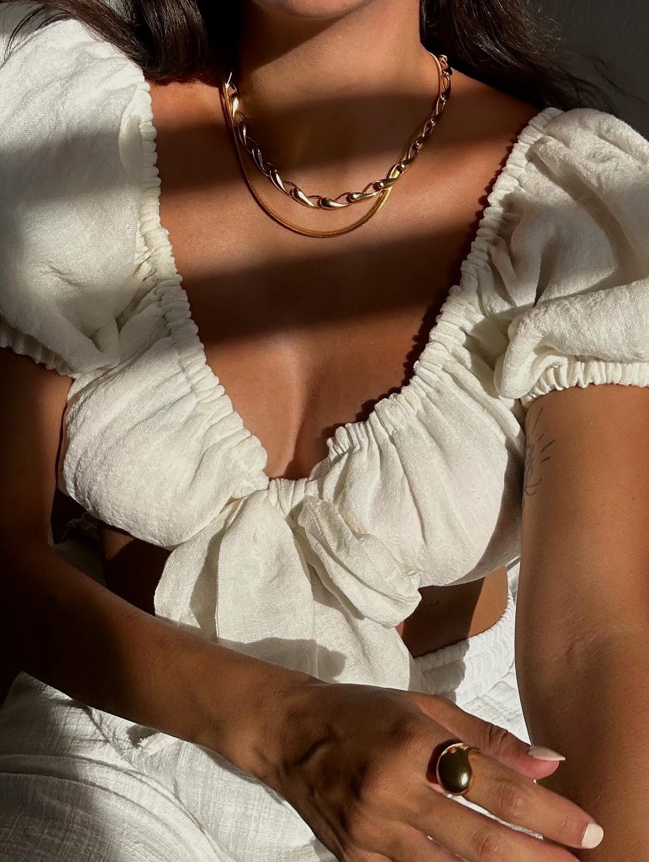 Summers staple, our linen off shoulder top is perfect to be worn to the beach or in the city. It has a front bow closure and can also be worn on the shoulders.