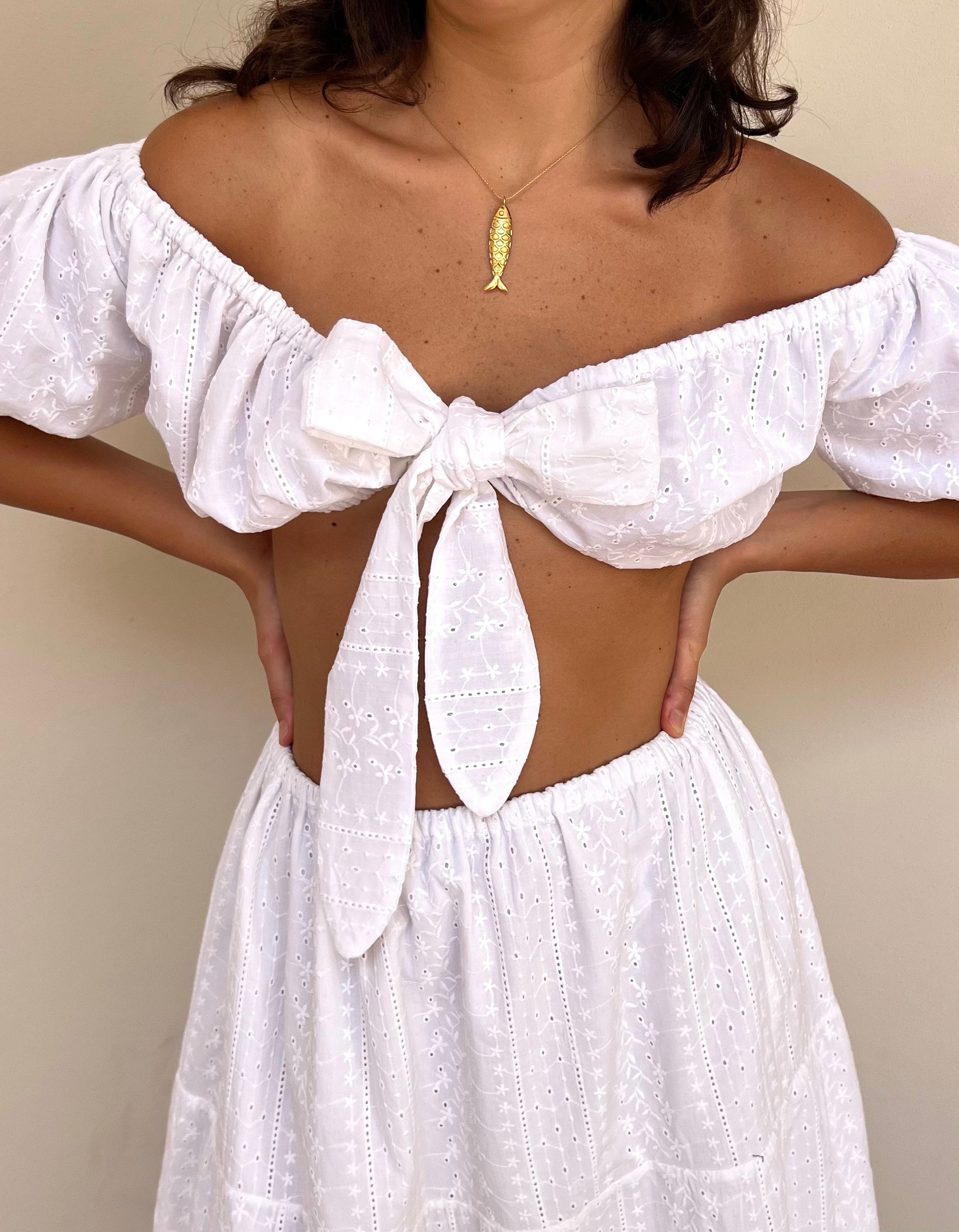 The Lindsey Top is back, and this time with our new summer fabric. It has a front bow closure and can also be worn on or off shoulder. Made in the same cotton as the Eva skirt to be able to mix and match together.