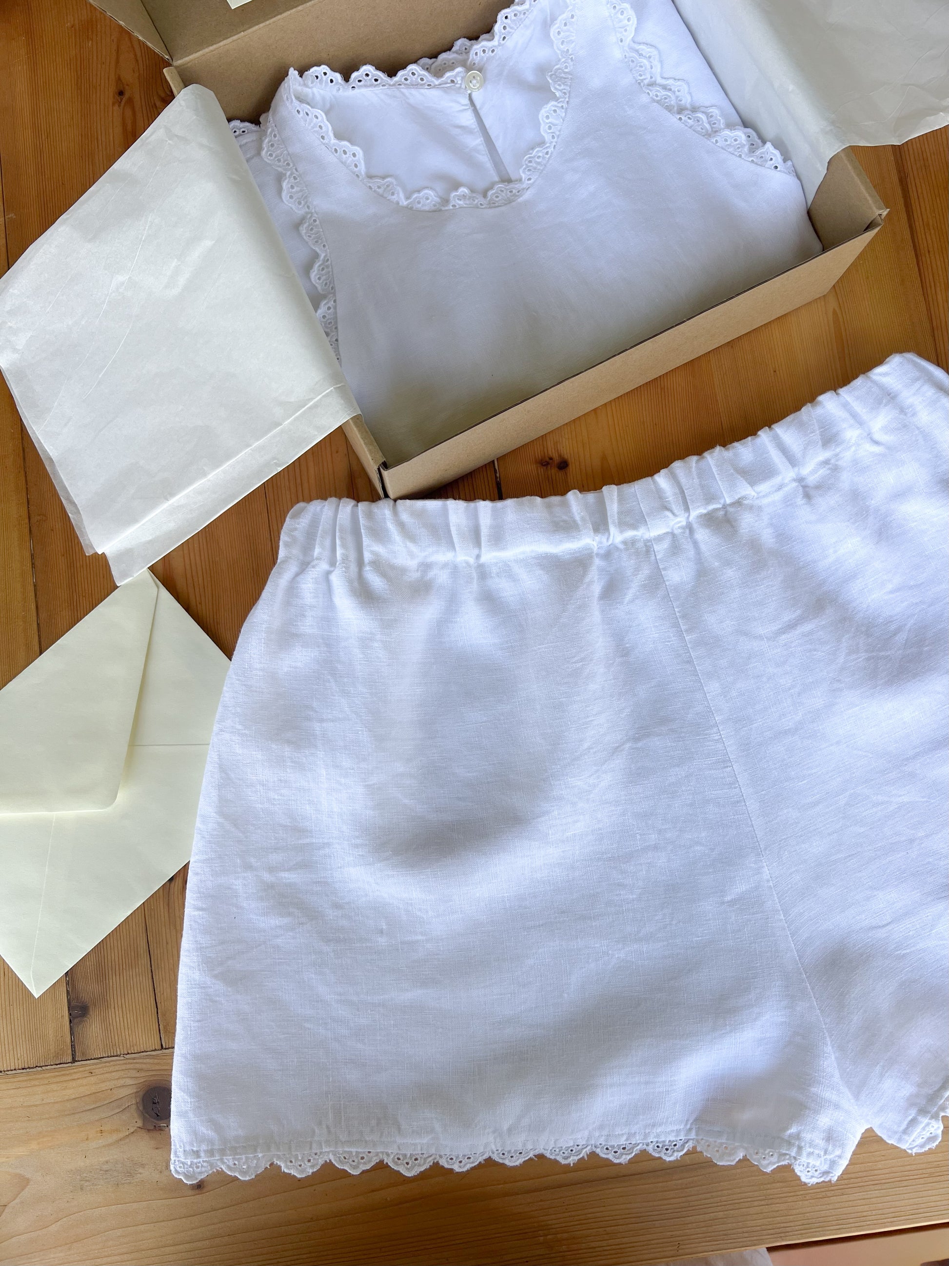 The Matilda Short is handmade with 100% linen and has a chic embroidered finish. Pair it with the Matilda top. Also available as a dress.