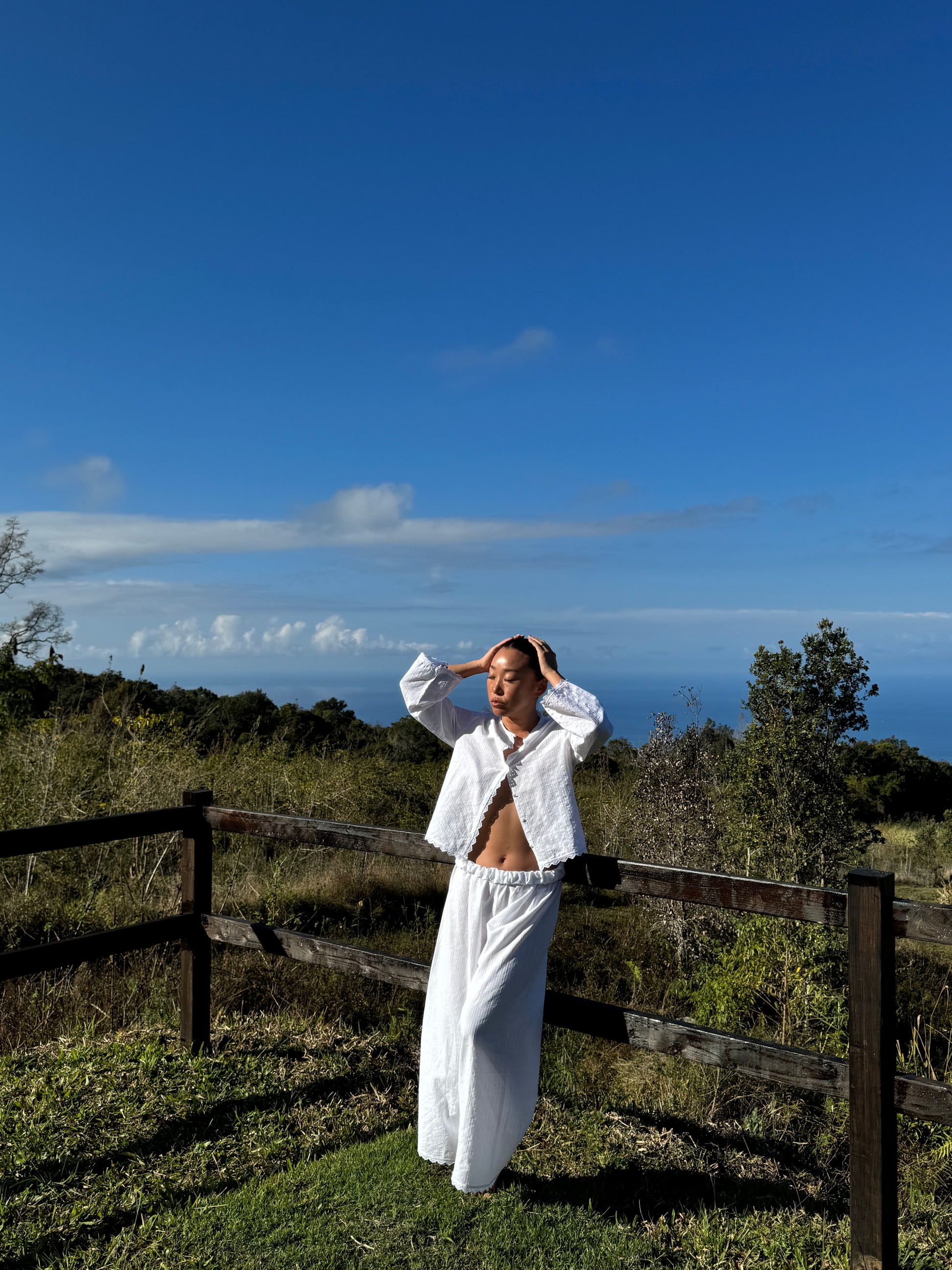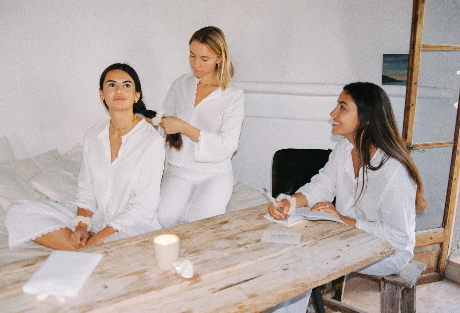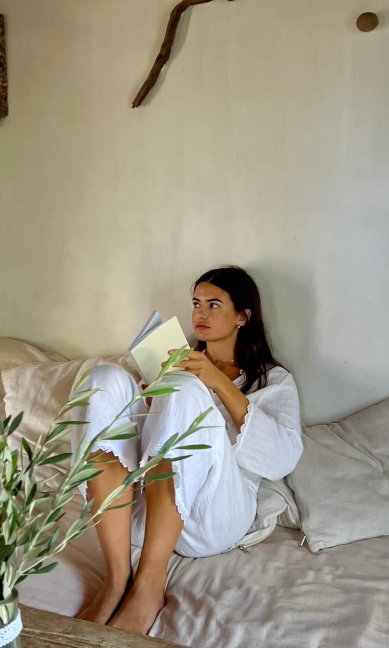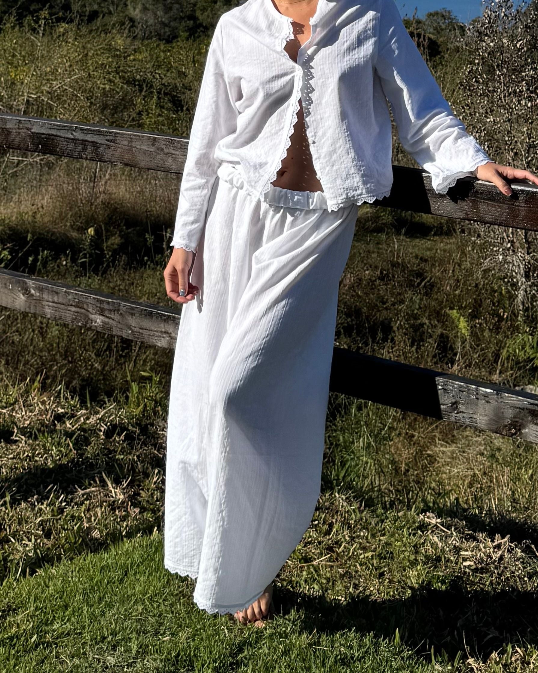 The ultimate Mediterranean pajama, lovingly handmade in Rome from soft, organic cotton and finished with the most beautiful lace. Inspired by the gentle pace of slow living in the Mediterranean, this set invites you to unwind and lounge in comfort, perfect for savoring serene mornings and leisurely afternoons.