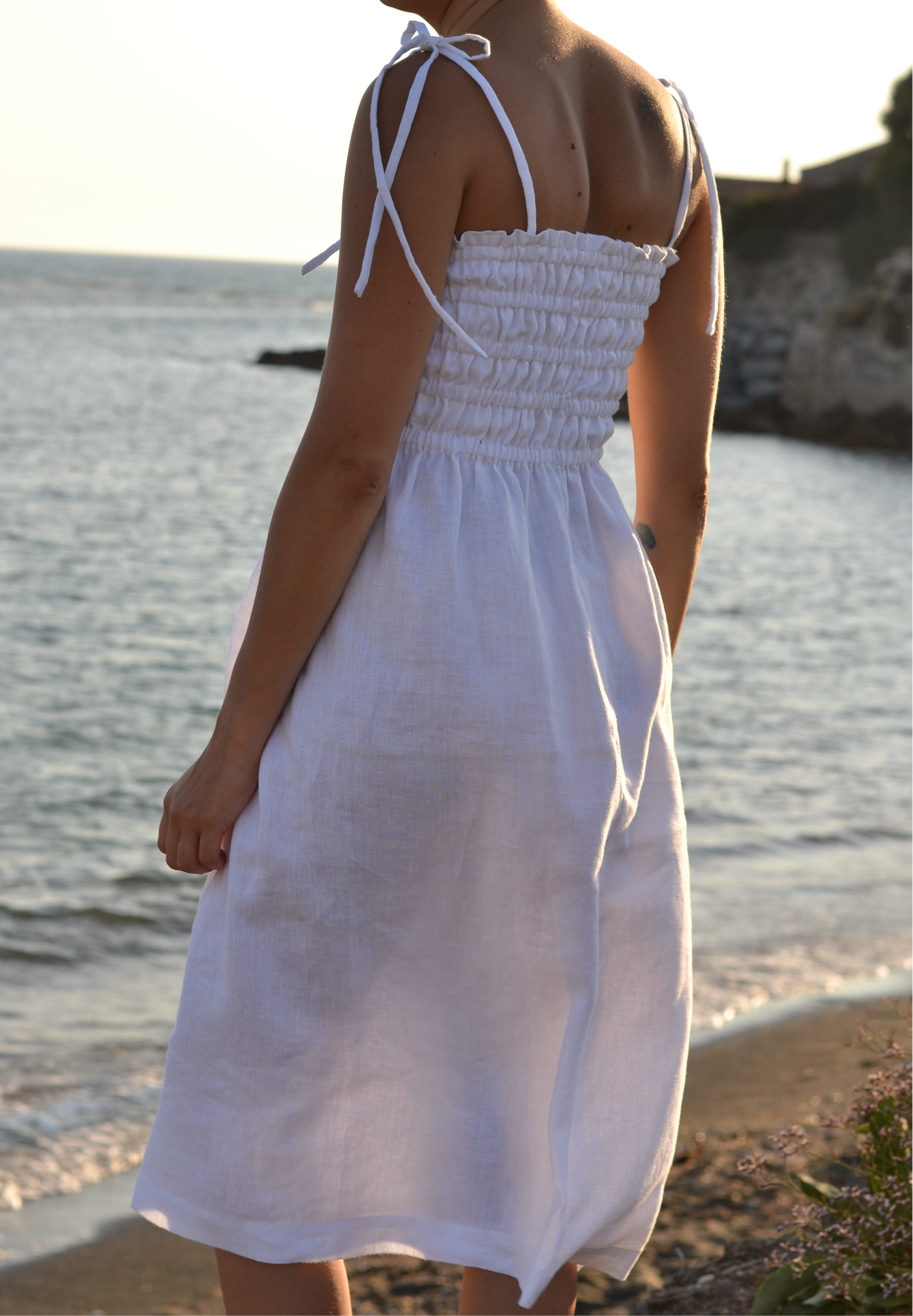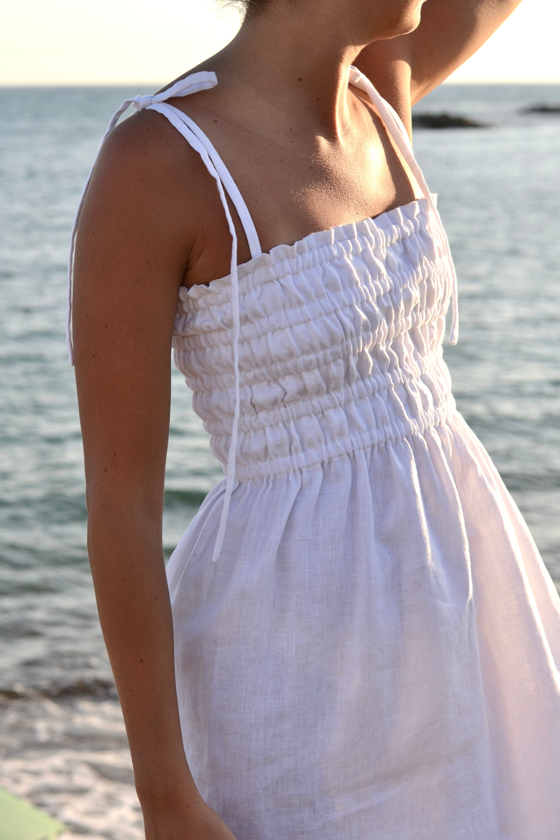 Introducing the Nora Dress, crafted from 100% Italian linen for a comfortable and luxurious feel. Its tie straps and ruffled waist add a touch of elegance to the sleek silhouette.