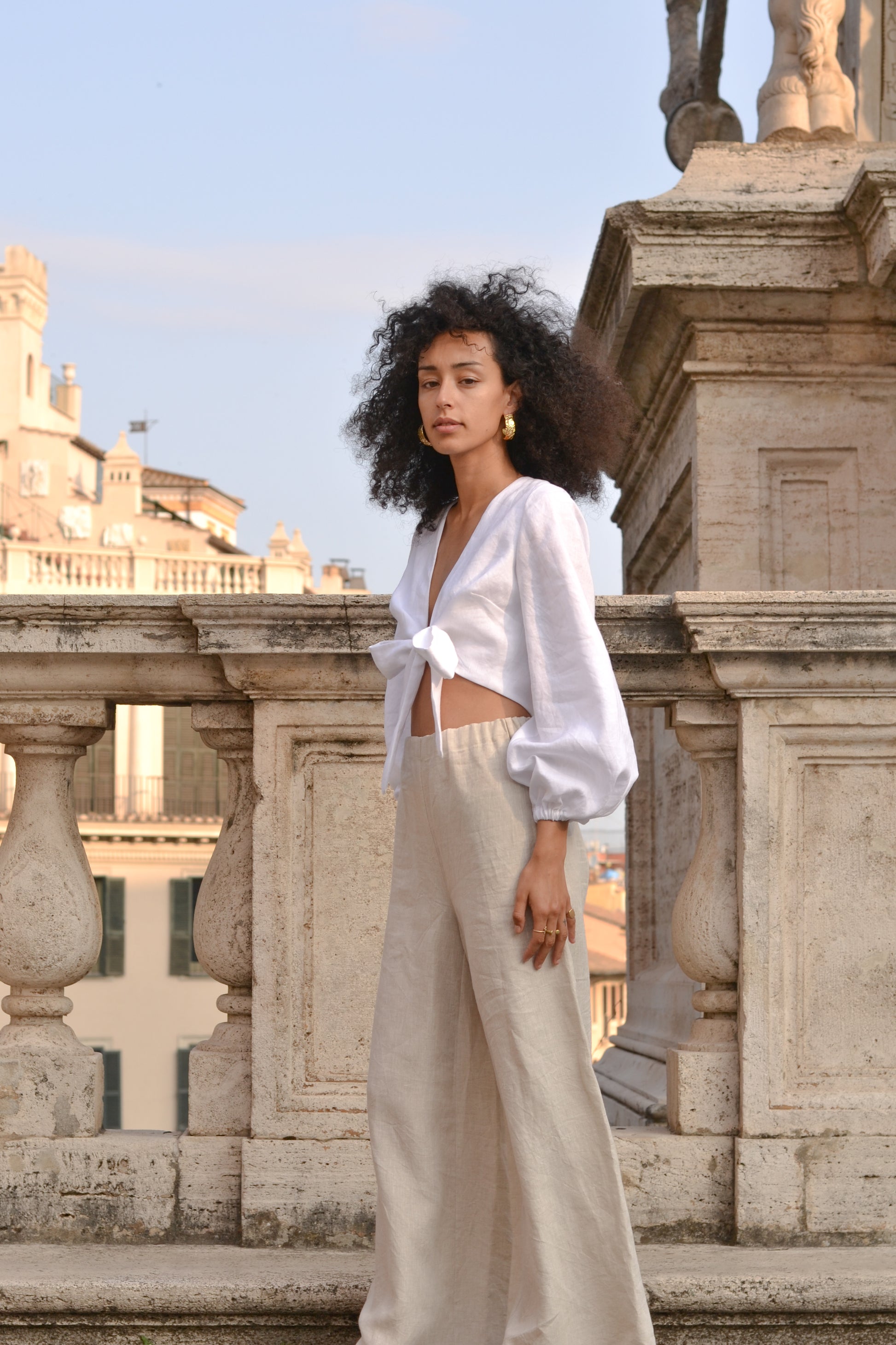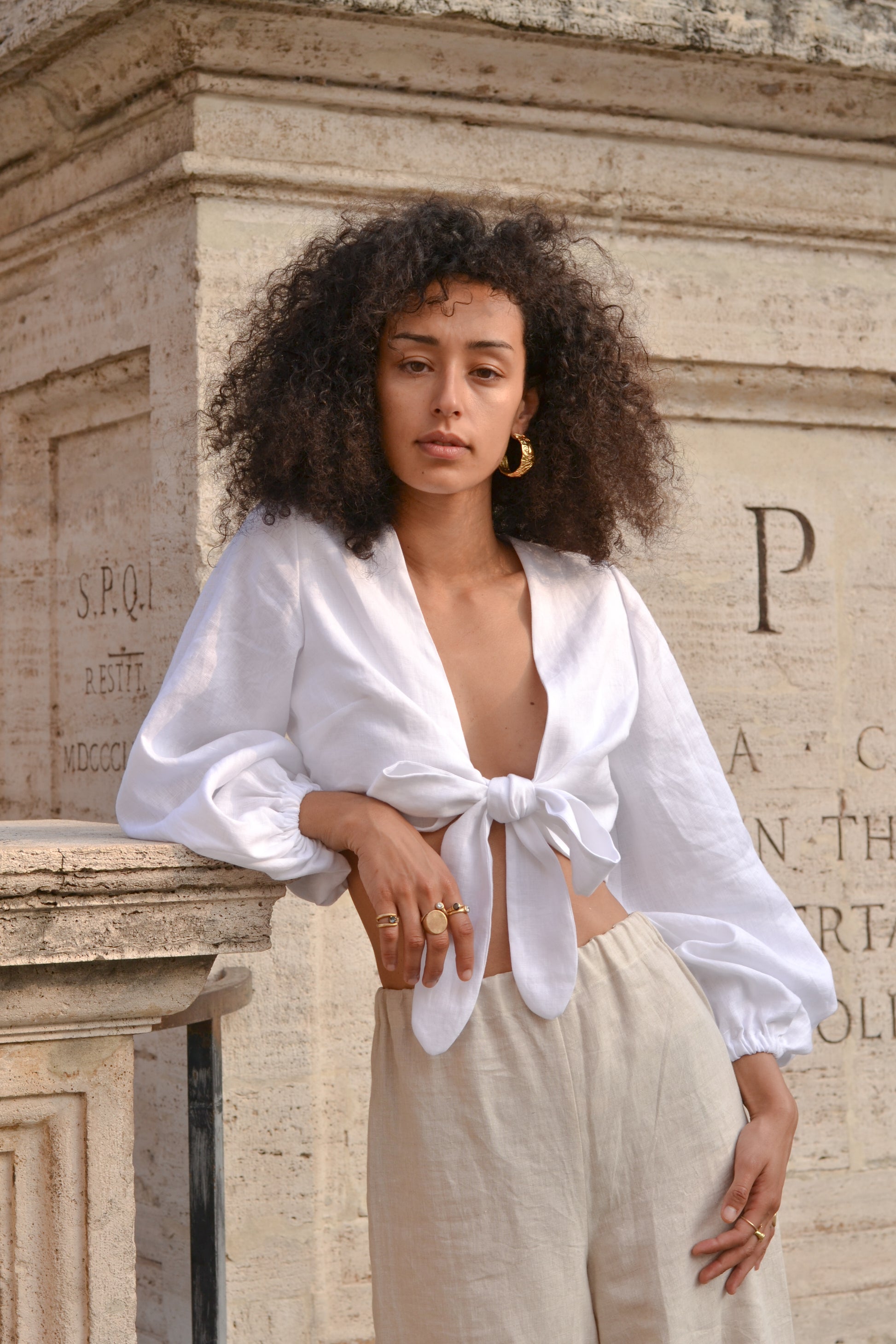Our Sophie top is made with 100% Italian linen and is versatile to wear throughout seasons. It has long sleeves and ties with a front bow. The light linen makes it breathable to wear in the summer.