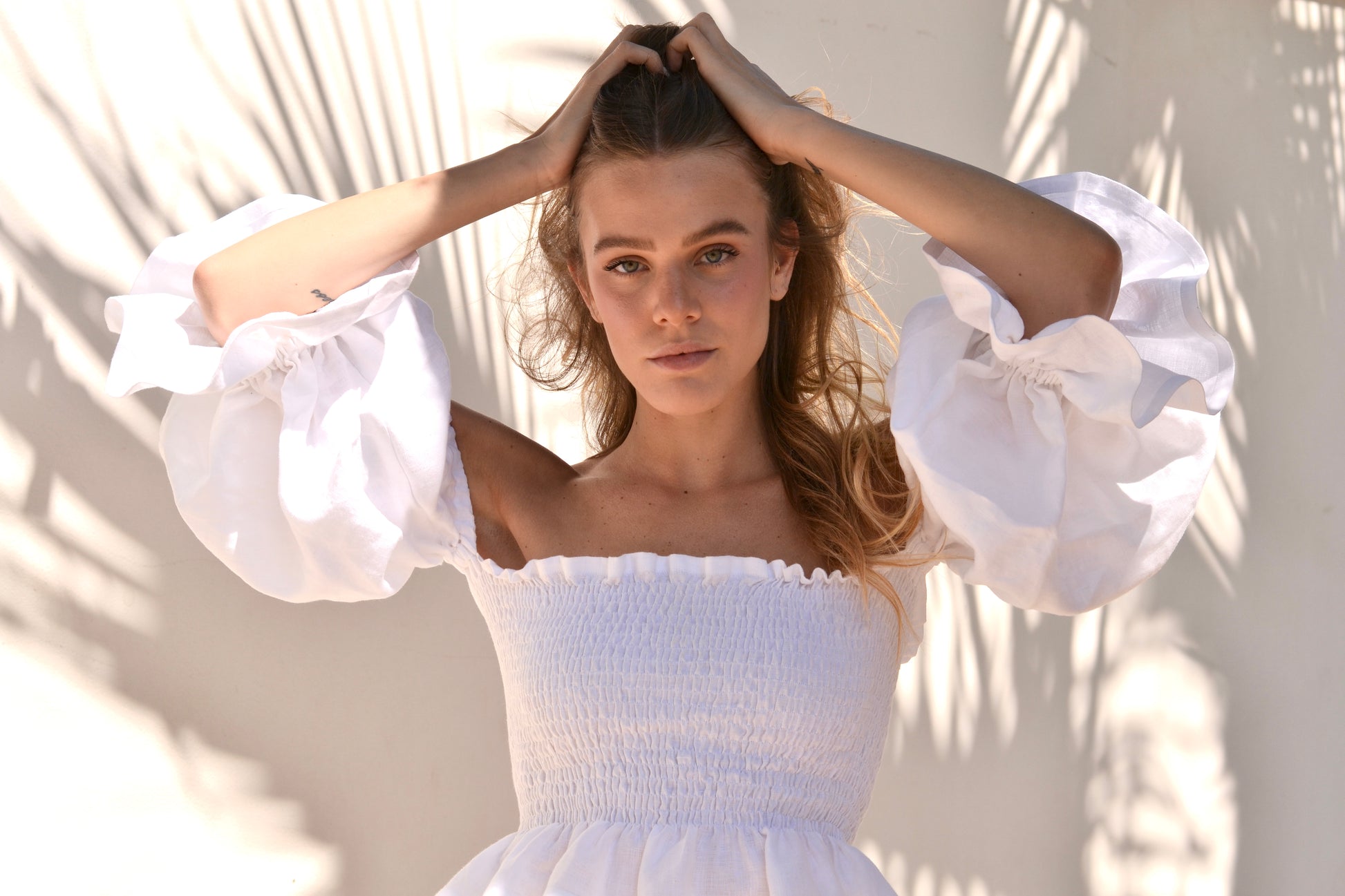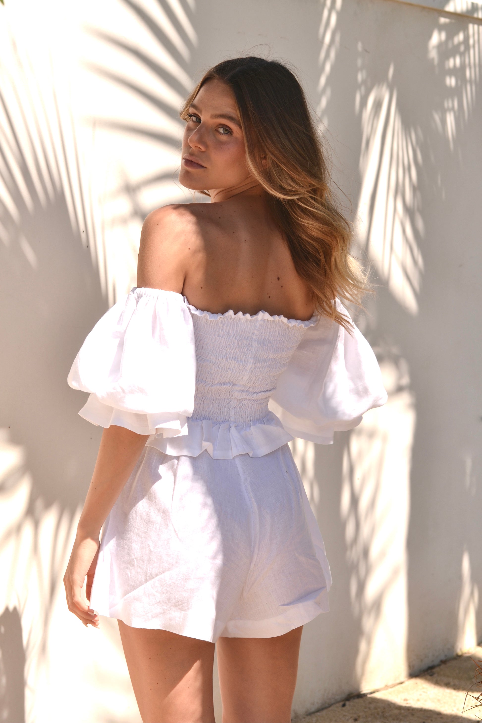 The Stella Top has a beautifully detailed waist and puffy off shoulder sleeves. It is the perfect piece to go from day to night and is also available as a top.